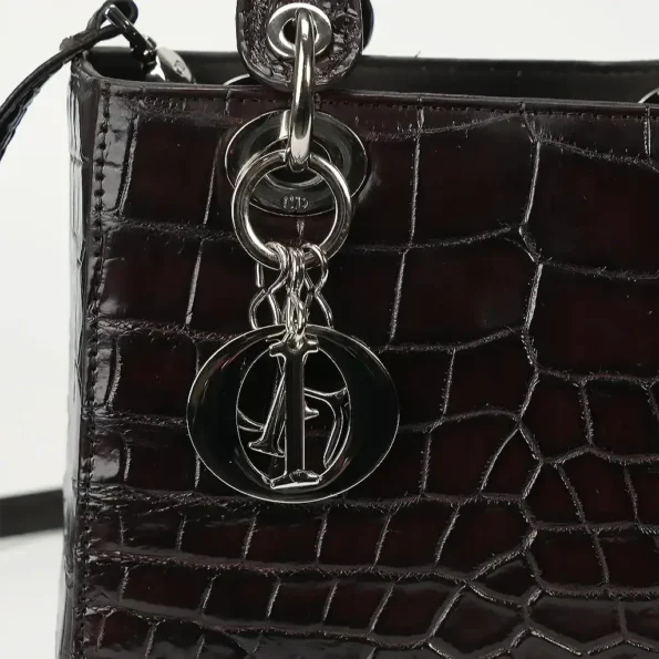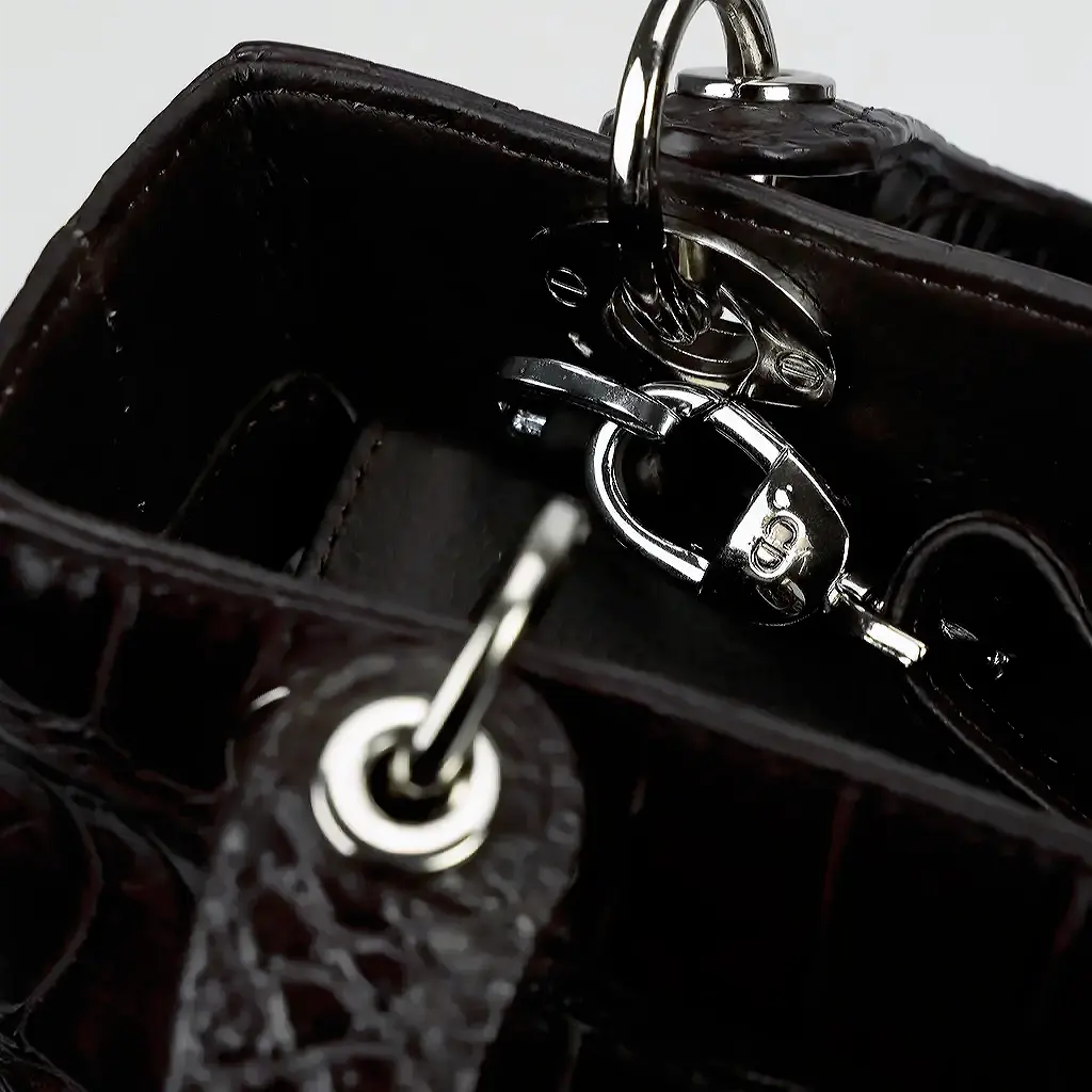 - Hai quai xách tròn được bọc da cá sấu, kết hợp dây đeo dài tháo rời linh hoạt – giúp bạn dễ dàng biến đổi phong cách từ xách tay, đeo vai đến đeo chéo.